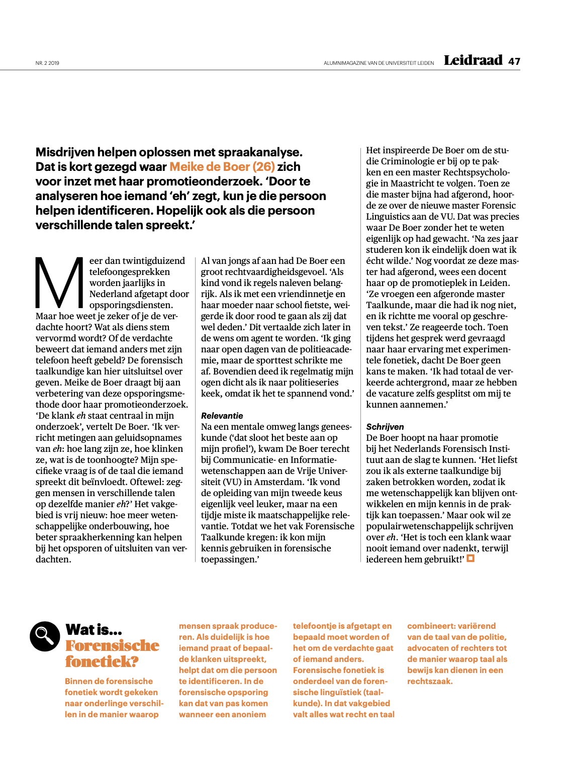 Misdrijven helpen oplossen met spraakanalyse. Dat is kort gezegd waar Meike de Boer (26) zich voor inzet met haar promotieonderzoek. ‘Door te analyseren hoe iemand ‘eh’ zegt, kun je die persoon helpen identificeren. Hopelijk ook als die persoon verschillende talen spreekt.’