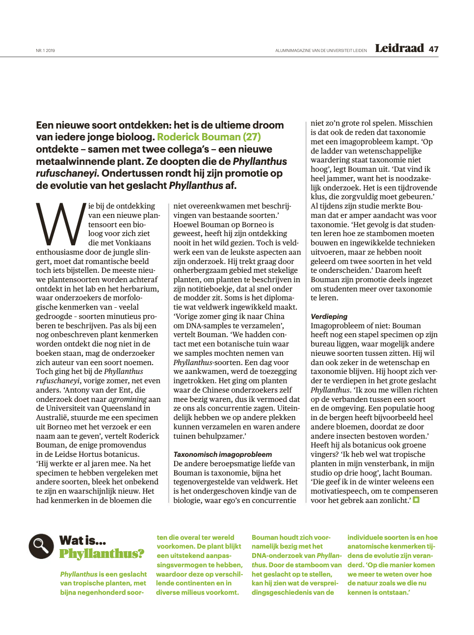 Een nieuwe soort ontdekken: het is de ultieme droom van iedere jonge bioloog. Roderick Bouman (27) ontdekte – samen met twee collega’s – een nieuwe metaalwinnende plant. Ze doopten haar de Phyllanthus rufuschaneyi. Ondertussen rondt hij zijn promotie op de evolutie van het geslacht Phyllanthusaf, waarbij hij het DNA, de mutaties en verspreiding van de honderden soorten in kaart probeert te brengen.
