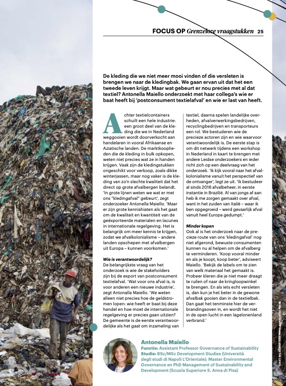 De kleding die we niet meer mooi vinden of die versleten is brengen we naar de kledingbak. We gaan ervan uit dat het een tweede leven krijgt. Maar wat gebeurt er nou precies met al dat textiel? Antonella Maiello onderzoekt met haar collega’s wie er baat heeft bij ’postconsument textielafval’ en wie er last van heeft.