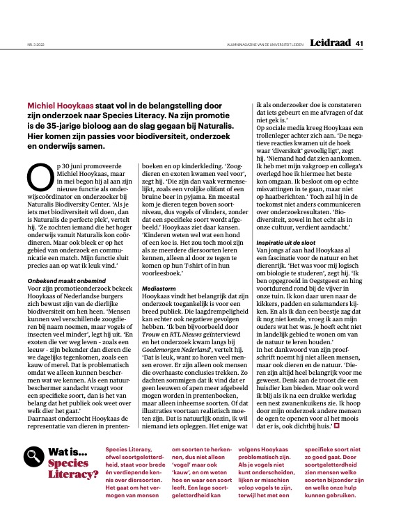 Michiel Hooykaas staat vol in de belangstelling door zijn onderzoek naar Species Literacy. Na zijn promotie is de 35-jarige bioloog aan de slag gegaan bij Naturalis. Hier komen zijn passies voor biodiversiteit, onderzoek en onderwijs samen.