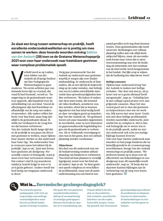 Een foto van het artikel met forensisch gezinspedagoog Sabine van der Asdonk over kwetsbare gezinnen.