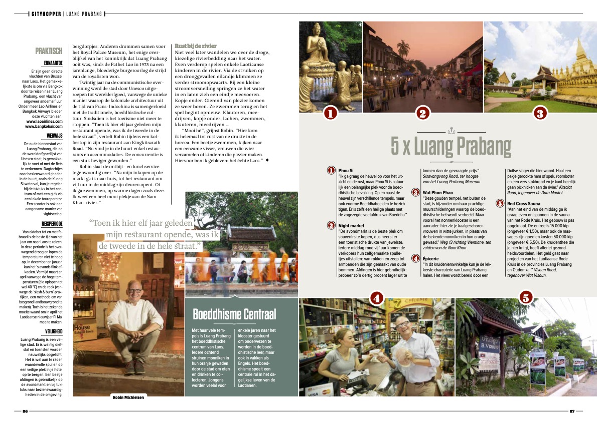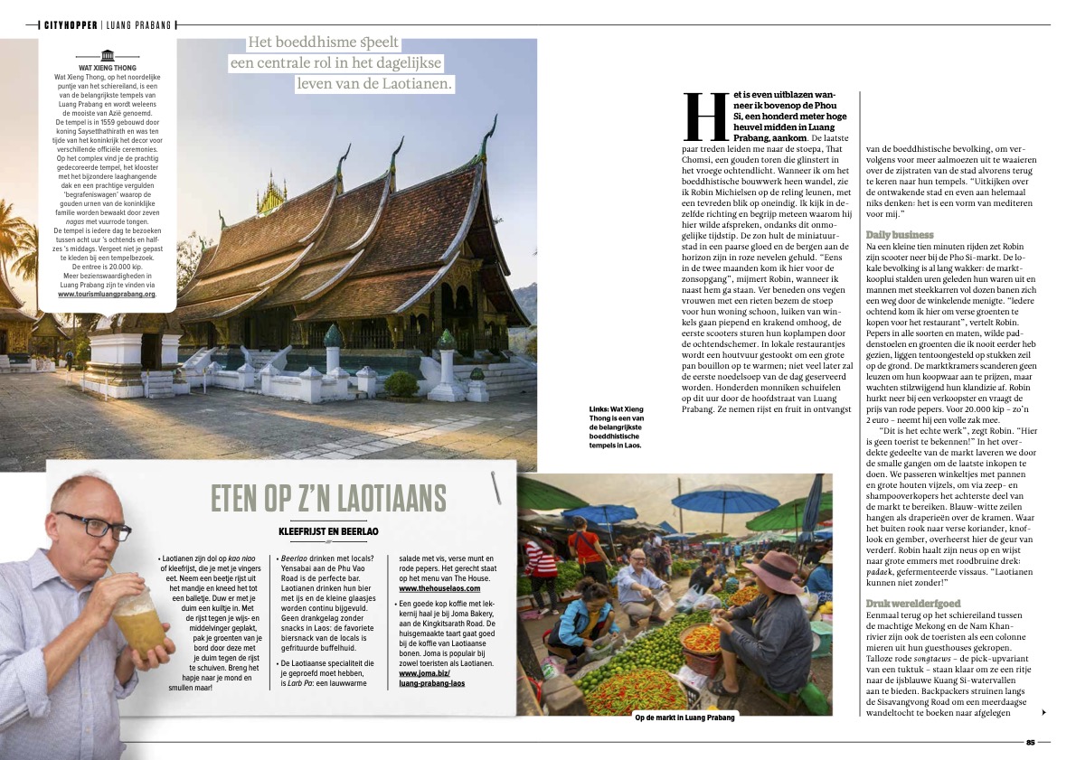 Luang Prabang, de UNESCO-werelderfgoedstad in het noorden van Laos, wordt gekenmerkt door haar unieke mengeling van Boeddhistisch erfgoed, koloniale architectuur uit de tijd van Frans-Indochina en oprechte vriendelijkheid van de Laotianen. Robin Michielsen is de eigenaar van restaurant en Belgisch biercafé The House, maar neemt geregeld de scooter naar plekken die alleen locals kennen. “Laos blijft me nog altijd verbazen.”