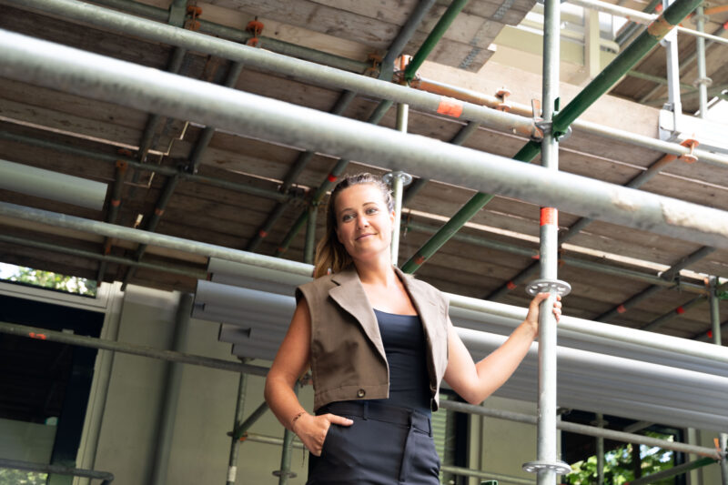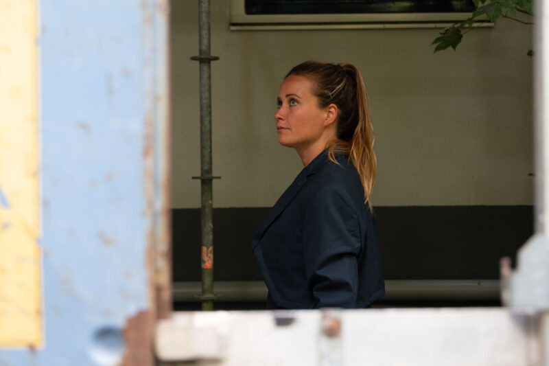 Model met een jasje van Rebel Remake in een industriële omgeving.
