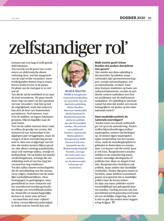 Steden zijn de toekomst. Althans, dat was decennialang het adagium. Maar de coronacrisis heeft juist steden buitensporig hard getroffen. Wat betekent dit voor de ontwikkeling van steden? Blijft hun aantrekkingskracht post-corona net zo groot? André Gerrits, hoogleraar en hoofd van de bacheloropleiding Urban Studies, kijkt vooruit naar de stad van 2030.