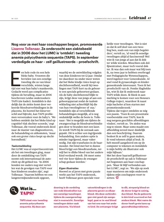 Nog voor ze met haar coschappen begon, promoveerde Lisanne Tollenaar. Ze onderzocht een ziektebeeld dat in 2006 door het LUMC is ‘ontdekt’: tweeling anemie polycythemie sequentie (TAPS). In september verdedigde ze haar – zelf geïllustreerde – proefschrift.