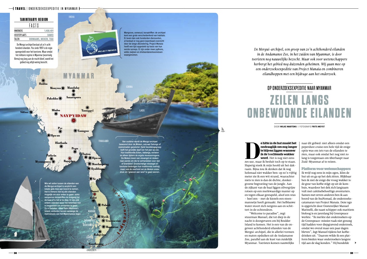 De Mergui Archipel, een groep van zo’n achthonderd eilanden in de Andamanse Zee, in het zuiden van het Zuidoost-Aziatische Myanmar, is door toeristen nog nauwelijks bezocht. Maar ook voor wetenschappers herbergt het gebied nog duizenden geheimen. Ik ga mee op een onderzoeksexpeditie van Project Manaia en combineer island hoppen met een bijdrage aan wetenschappelijk onderzoek.