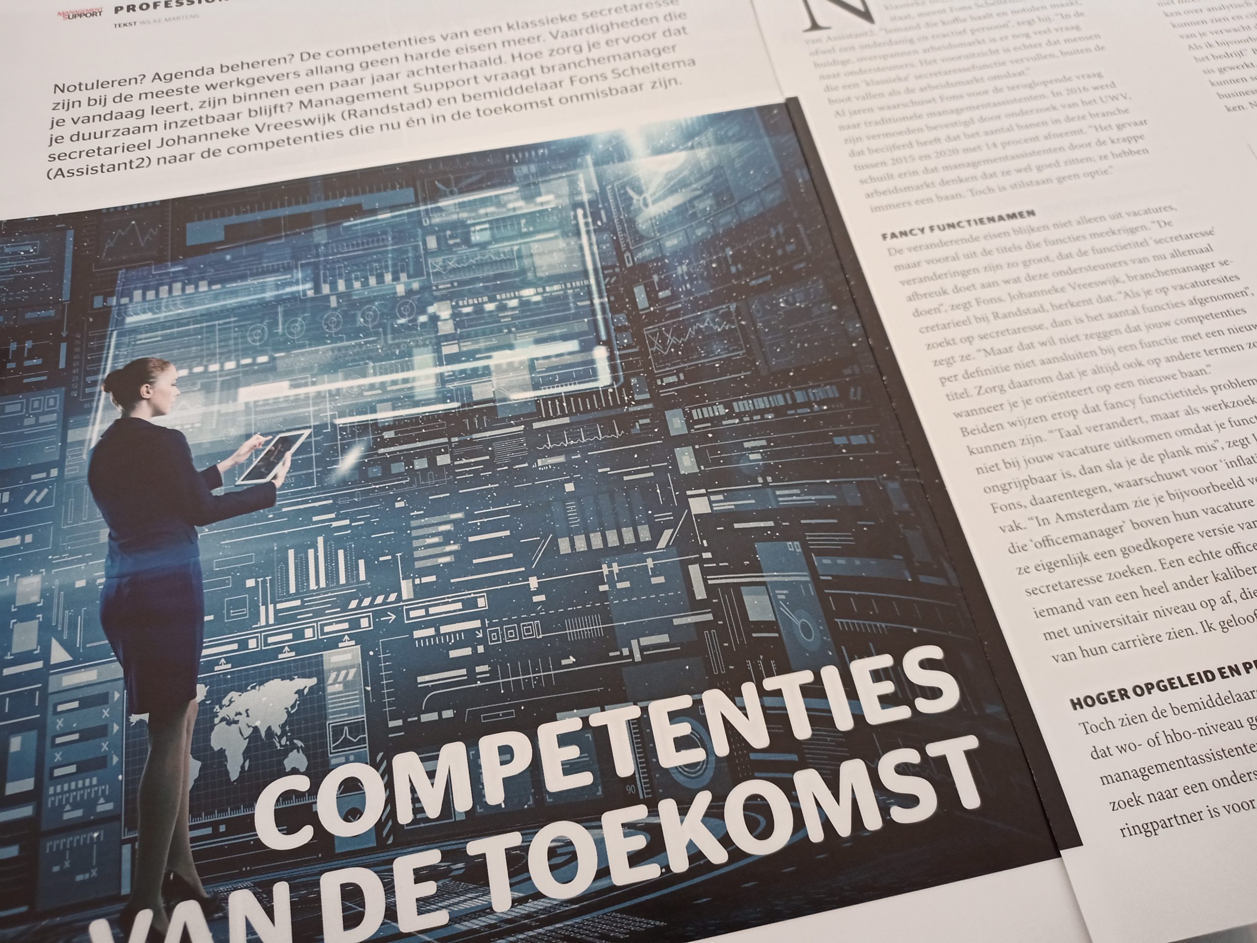 Notuleren? Agenda beheren? De competenties van een klassieke secretaresse zijn bij de meeste werkgevers allang geen harde eisen meer. Vaardigheden die je vandaag leert, zijn binnen een paar jaar achterhaald. Hoe zorg je ervoor dat je duurzaam inzetbaar blijft? Management Support vraagt branchemanager secretarieel Johanneke Vreeswijk (Randstad) en bemiddelaar Fons Scheltema (Assistant2) naar de competenties die nu én in de toekomst onmisbaar zijn. VOOR Management Support WAT artikel WANNEER juni 2019 LINK Management Support Nog altijd zijn er