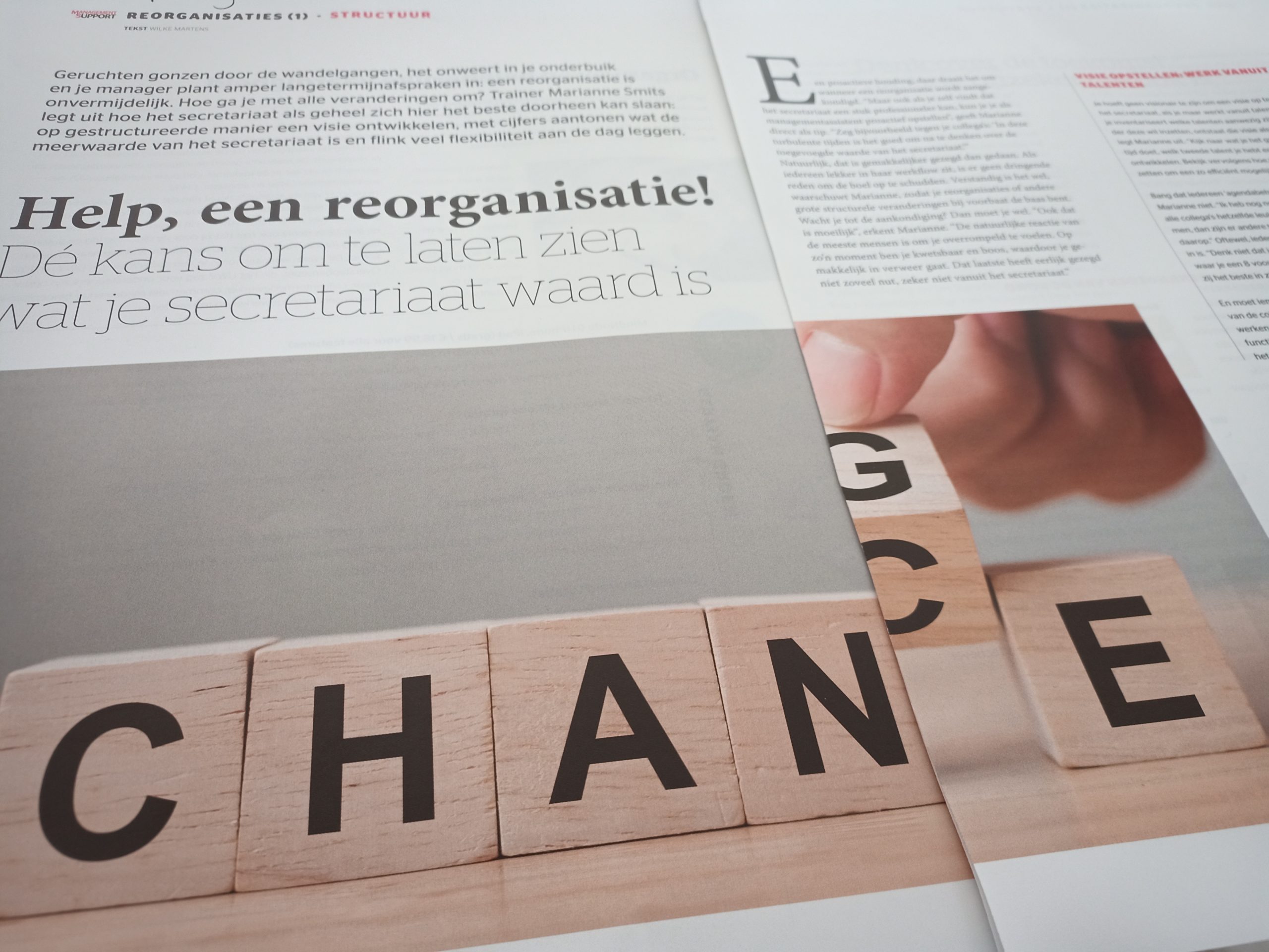 Geruchten gonzen door de wandelgangen, je voelt het al onweren in je onderbuik en je manager plant amper afspraken op lange termijn: een reorganisatie bij het bedrijf waar je al jaren werkt is onvermijdelijk. Wat kun je als managementassistent doen om zo goed mogelijk met de veranderingen om te gaan? En – belangrijker nog – hoe vergroot je de kans dat je je baan houdt? Trainer Marianne Smits legt uit hoe het secretariaat als geheel zich hier beste doorheen kan slaan. “Onthoud: elke verandering biedt kansen.” VOOR Management Support