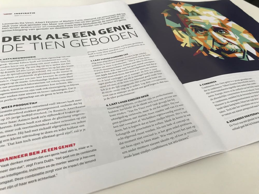 Leonardo Da Vinci, Albert Einstein of Madam Curie: niemand zal ontkennen dat het stuk voor stuk genieën zijn. Maar wat maakt ze tot een genie? En wat kun je van hen leren? Breintrainer en consultant Frans Duijts bestudeerde de werkwijze en gedachtegang van genieën en destilleerde tien geboden om te denken als genie. VOOR Management Support WAT artikel WANNEER april 2019 LINK Management Support 1. Wees nieuwsgierig “Nieuwsgierigheid is de belangrijkste eigenschap van een genie. Thomas Edison heeft