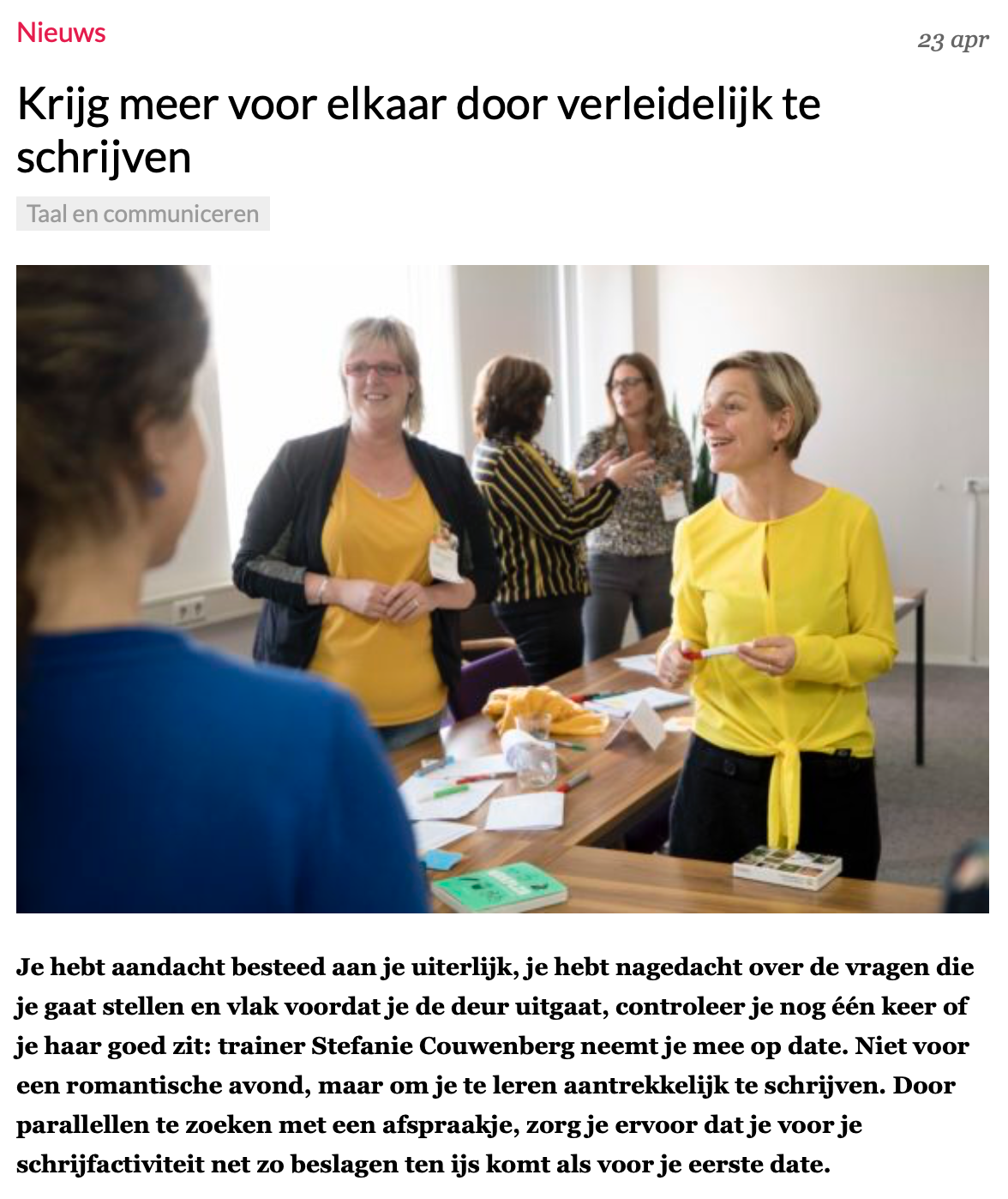 Je hebt aandacht besteed aan je uiterlijk, je hebt nagedacht over de vragen die je wil stellen en vlak voordat je de deur uitgaat, kijk je nog een keer in de spiegel: trainer Stefanie Couwenberg neemt je mee op date. Niet voor een romantische avond, maar om je te leren aantrekkelijk te schrijven. Door parallellen te zoeken met een afspraakje, zorg je ervoor dat je voor je schrijfactiviteit net zo beslagen ten ijs komt als voor je eerste date. VOOR Management Support WAT artikel WANNEER