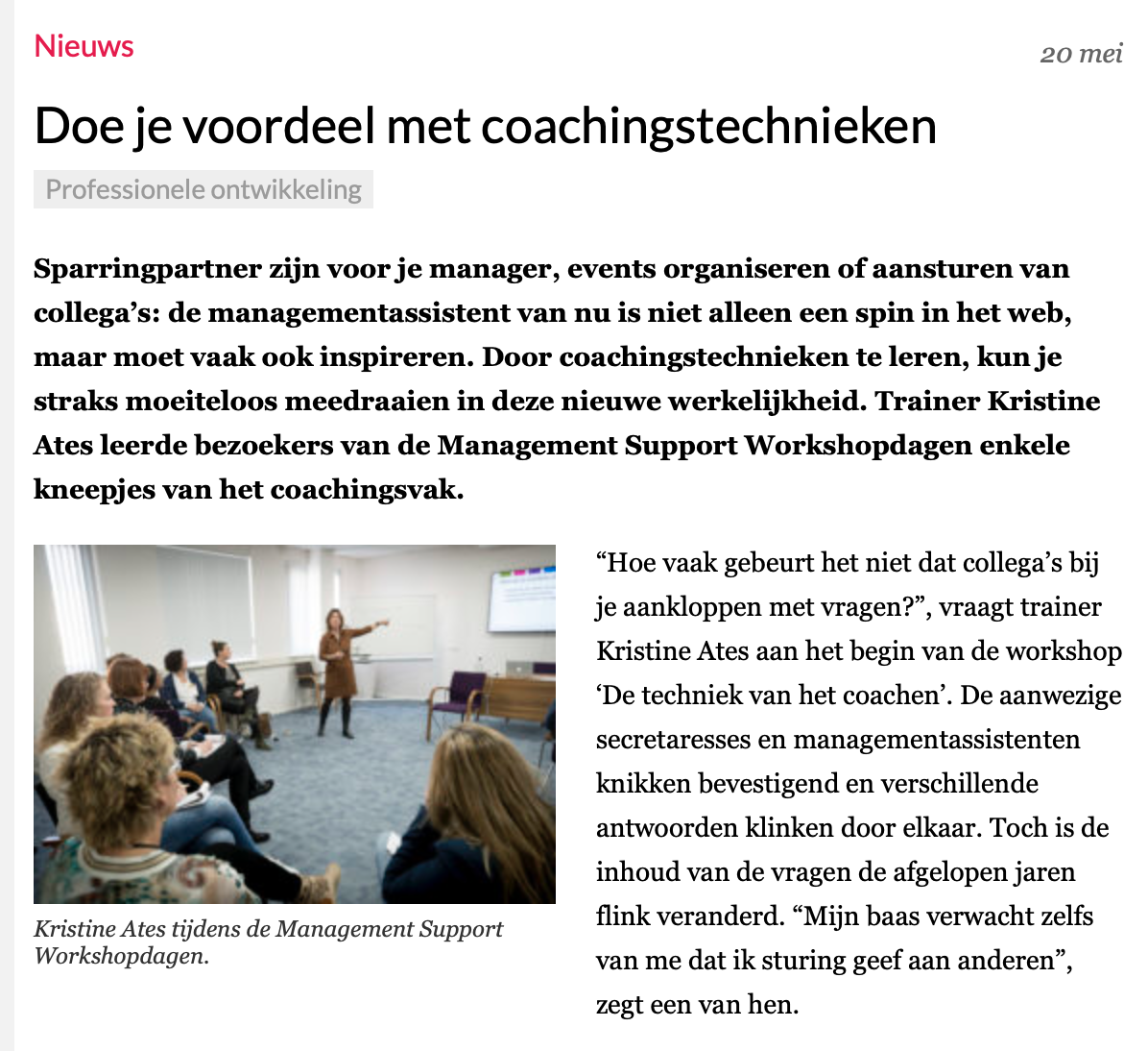 Sparringpartner zijn voor je manager, events organiseren of aansturen van collega’s: de managementassistent van nu is niet alleen een spin in het web, maar moet vaak ook inspireren. Door coachingstechnieken te leren, kun je straks moeiteloos meedraaien in deze nieuwe werkelijkheid. Trainer Kristine Ates leerde bezoekers van de Management Support Workshopdagen enkele kneepjes van het coachingsvak. VOOR Management Support WAT artikel WANNEER mei 2019 LINK Management Support Hoe groot de veranderingen ook zijn, het zijn er geen waarop